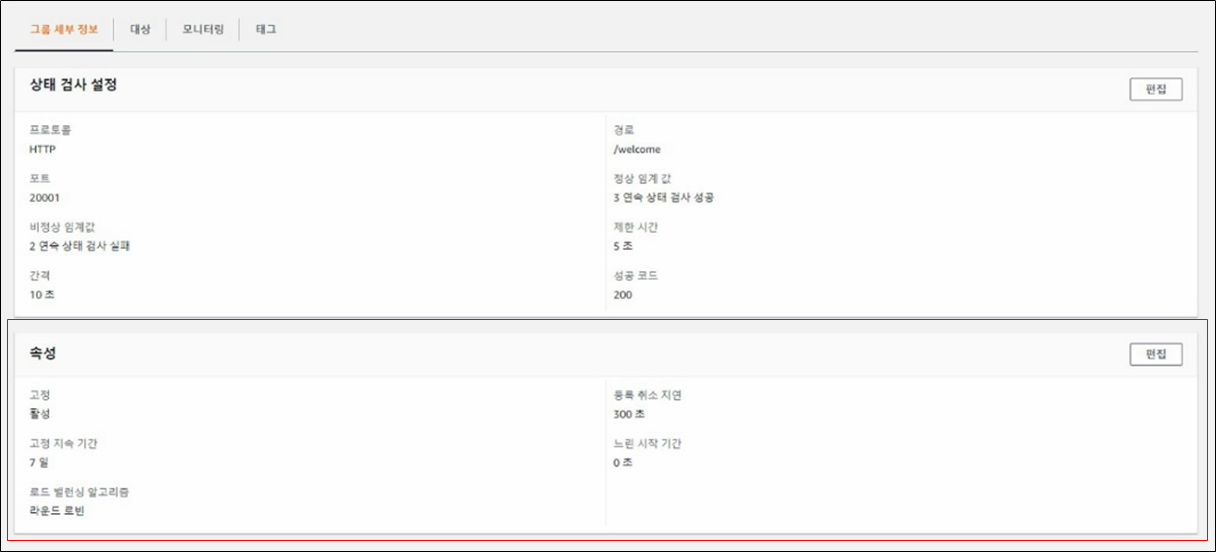 기존에 같은 환경과 구성으로 잘 돌아가고 있는 다른 서버에 구성된 LB와 비교해봤더니 "속성" 값에서 차이점을 발견했다.